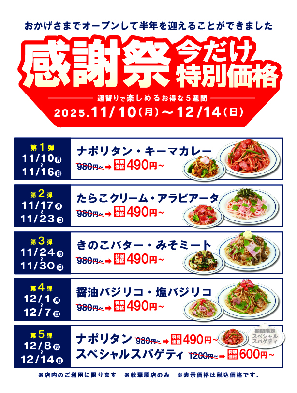 11月10日(月)より期間中スパゲティ2品を週替りで特別価格にて提供いたします。
